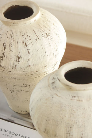 A highly decorative white-washed antique jar. These antique pots work great as everyday objects and help enhance any space with their ethnic look.