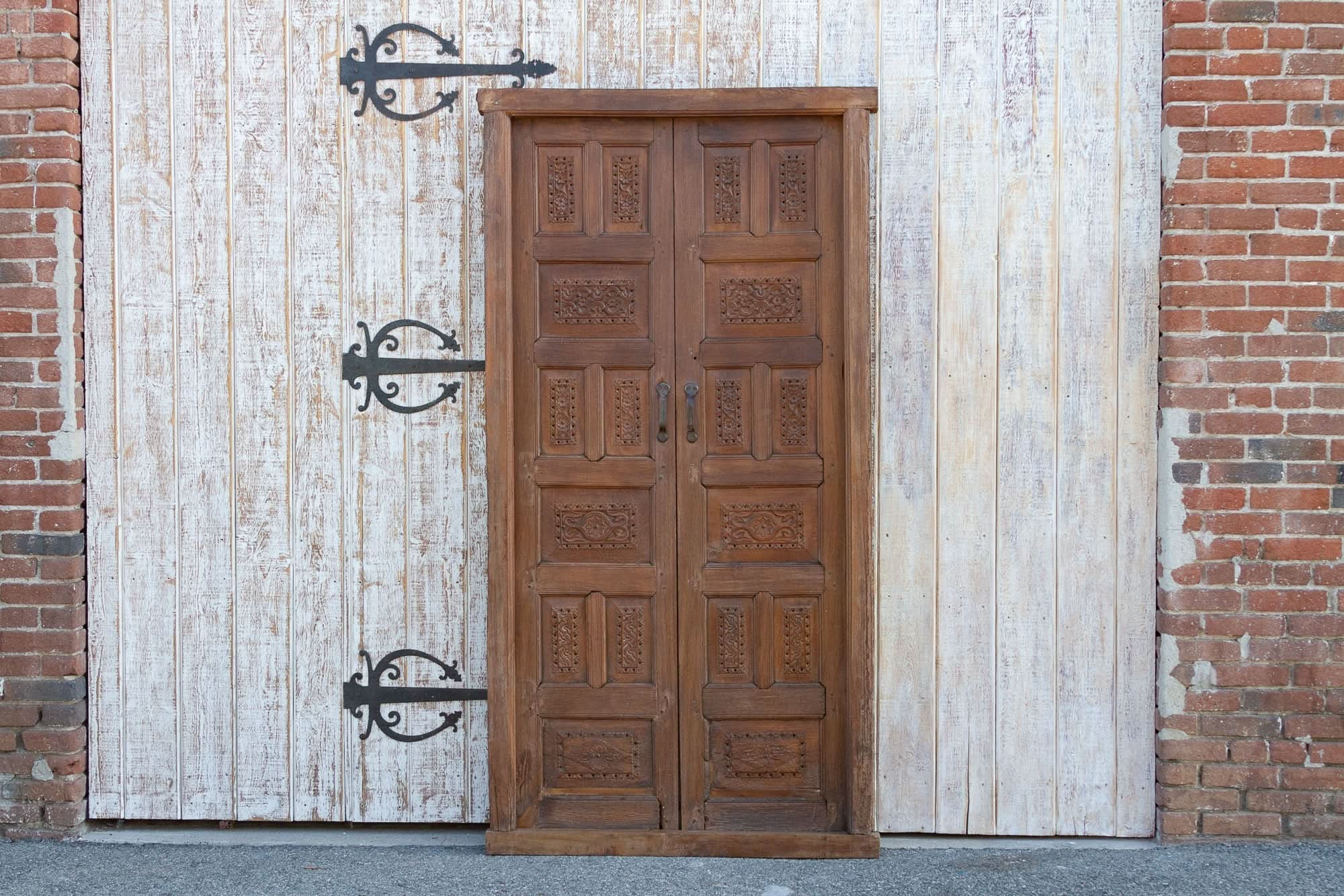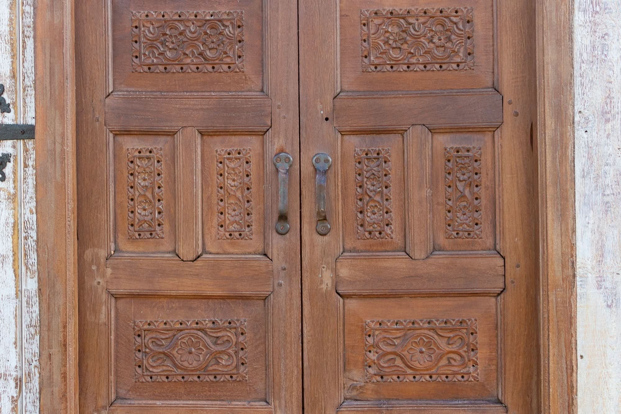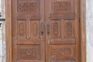 Impressive solid teak colonial doors with all the original embellishments and door panel carvings. These doors represents the fusion of Indian style with European tradition in architecture. The two doors are made from solid block of wood with original metal hardware and a stunning finished backside. With its geometrical and floral patterns combined with superb craftsmanship this piece demonstrates the best of the era.