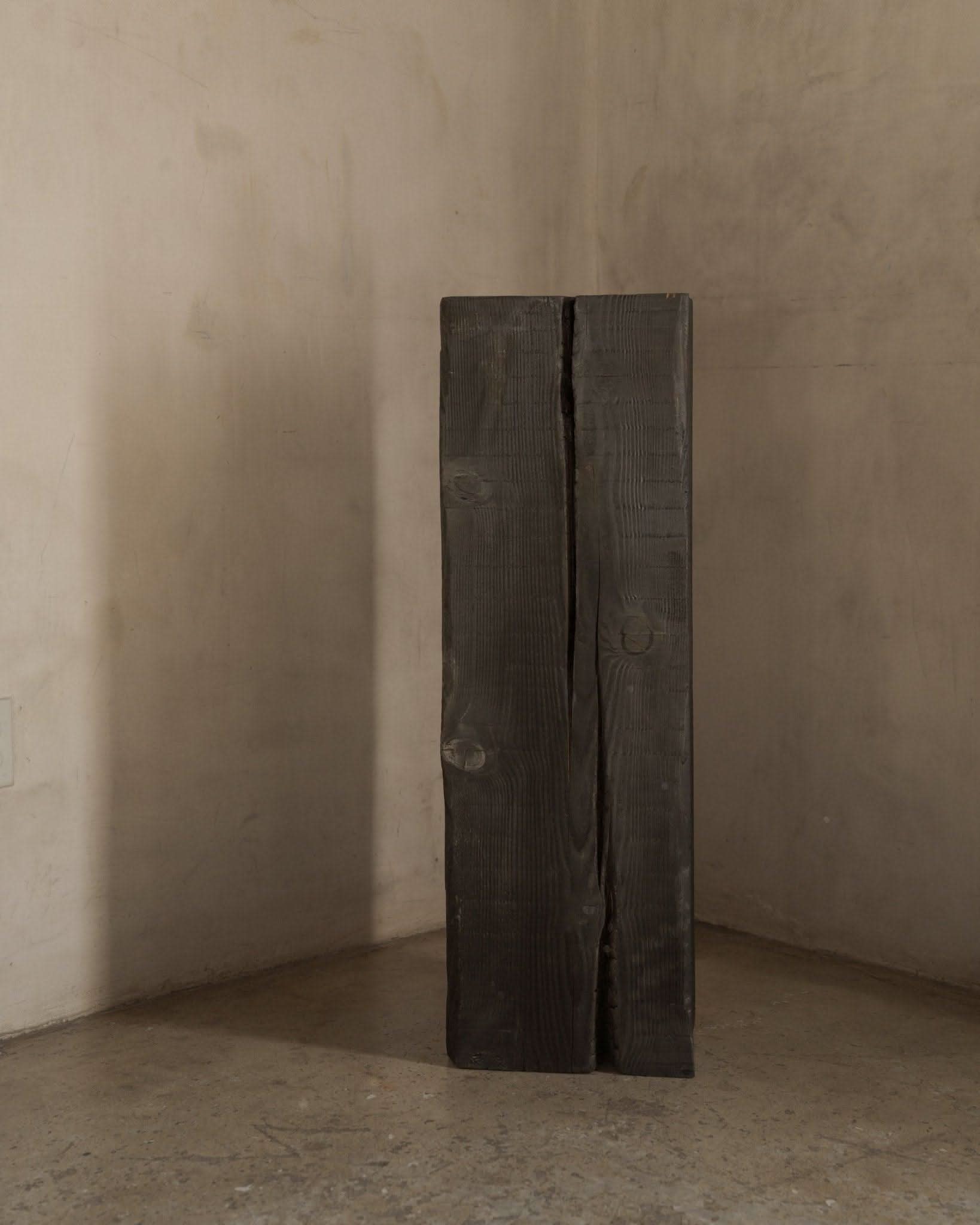 Finish: The piece, made of solid Douglas Fir wood, is then treated with the shou-sugi-ban application of burning the first few layers of wood and finished with a clear matte seal.