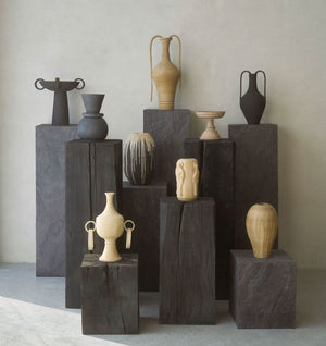 Sculptural in its own right, the Charcoal Sculpture Pedestal, crafted from solid Douglas Fir, undergoes the ancient shou-sugi-ban technique, revealing deep grooves and textures that evolve with time. As it ages, the wood tells its own story, expanding and shifting, showing hints of the natural grain beneath its burnished surface. Raw, organic, and unapologetically bold, this piece brings a sense of wild beauty into your home, letting nature take center stage.