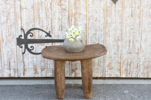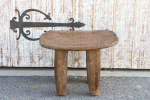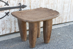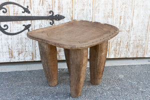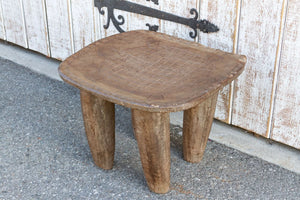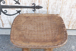 An antique tribal carved senufo table with a concave top that can be used as a side table or as a stool. It features a hand-carved turtle with a geometric tribal border all around. This antique table is carved from a single log of wood and stands on four solid tapered legs. This stool has a worn aged worn brown patina.