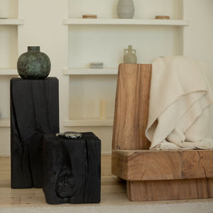 Escultural por sí mismo, el pedestal Charcoal Sculpture, elaborado con abeto Douglas macizo, se somete a la antigua técnica shou-sugi-ban, revelando profundos surcos y texturas que evolucionan con el tiempo. Con el paso del tiempo, la madera cuenta su propia historia, expandiéndose y transformándose, mostrando indicios de la veta natural bajo su superficie bruñida. Natural, orgánica y con una audacia sin complejos, esta pieza aporta una sensación de belleza salvaje a su hogar, dejando que la naturaleza sea la protagonista.