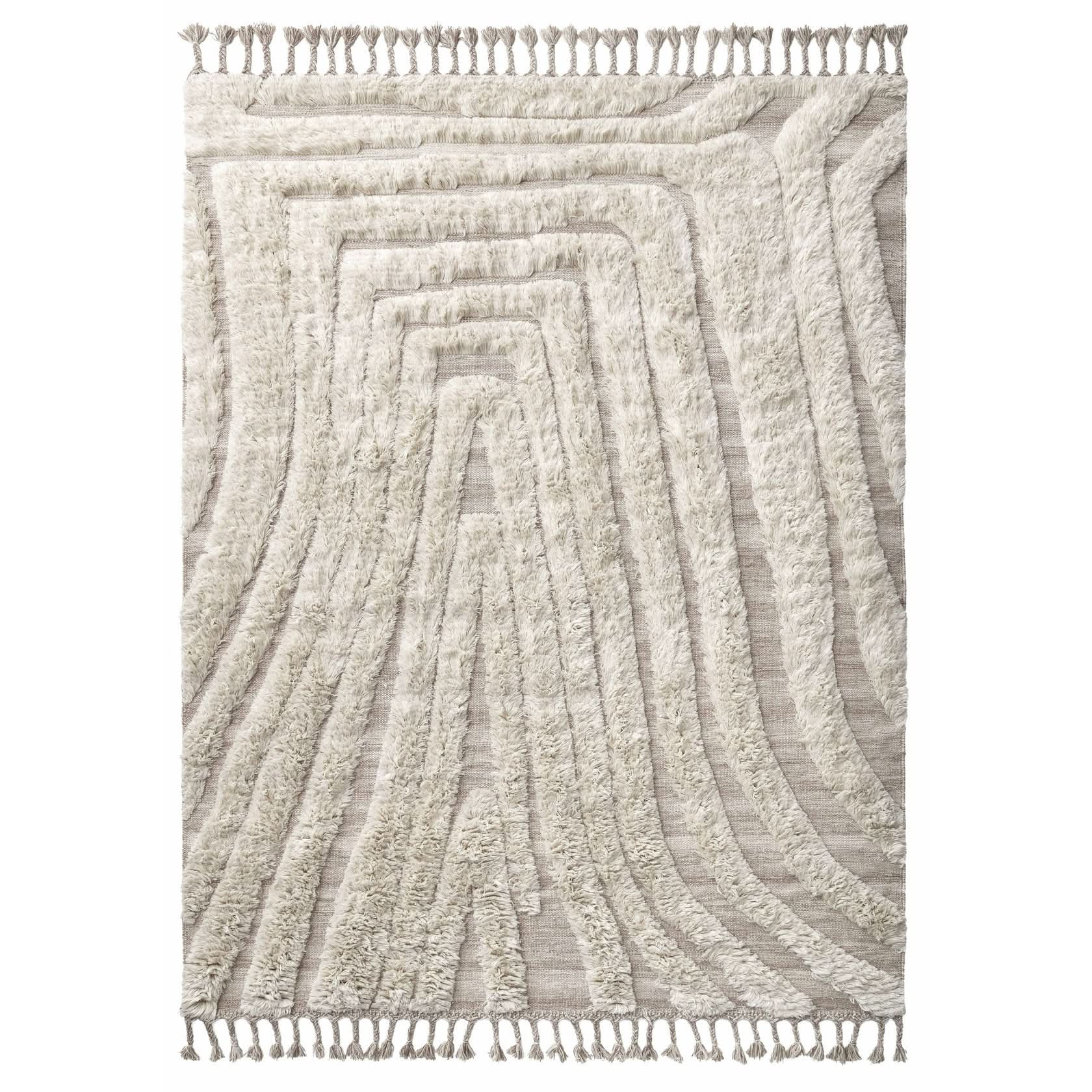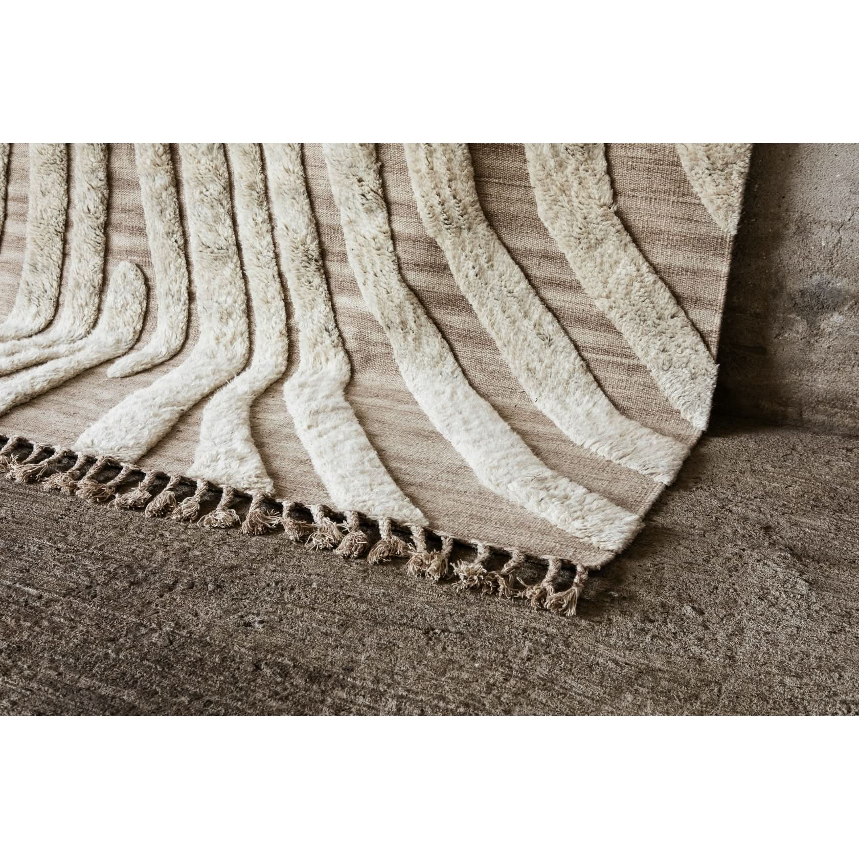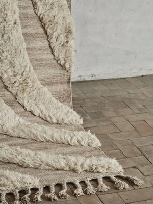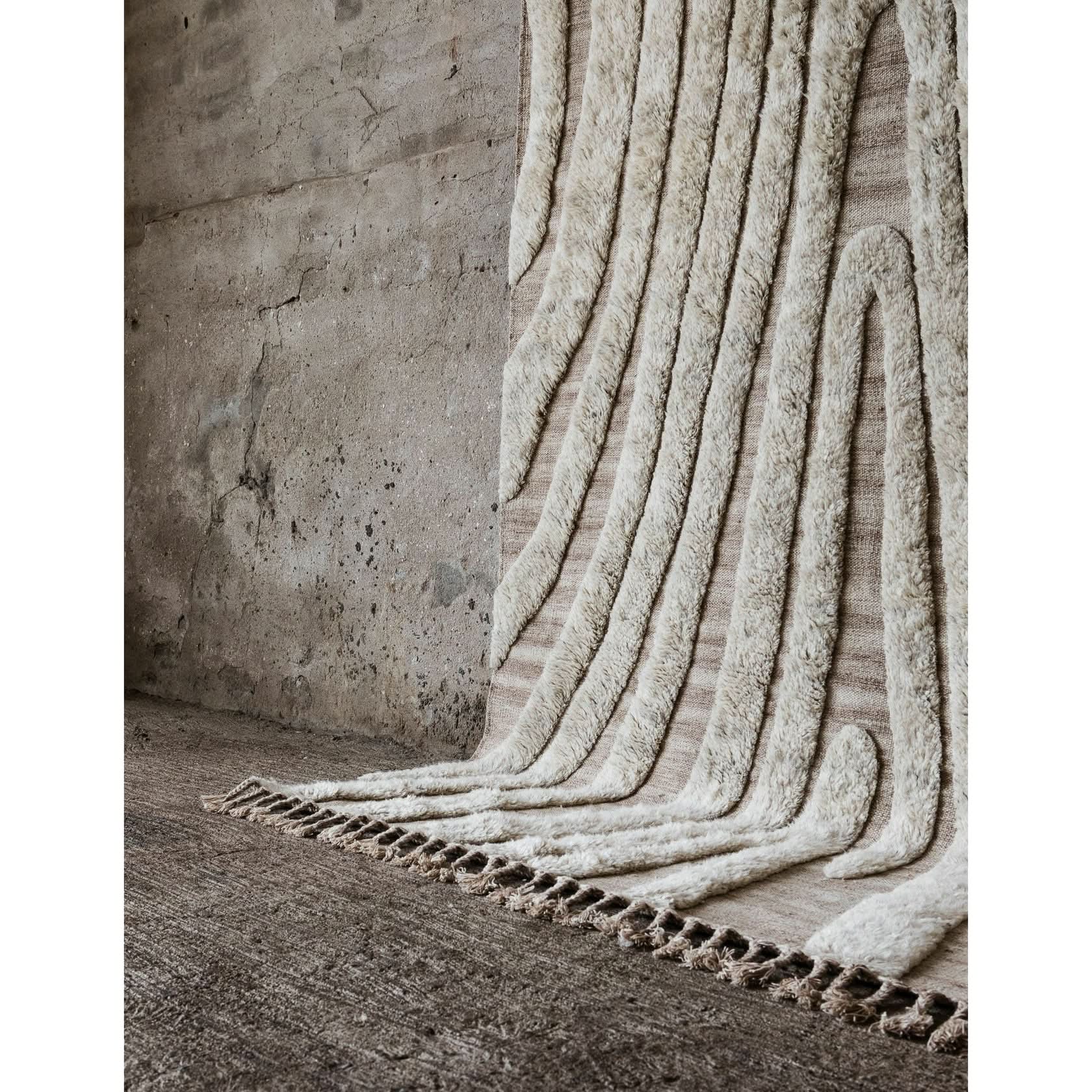 La alfombra n.° 02 es una alfombra decorativa anudada a mano en lana natural. Su suave diseño irregular crea una sensación vívida e intrigante. Está hecha de lana natural sin blanquear, con un pelo alto en blanco suave y un reverso color arena. Un borde largo con flecos realza el remate y añade un toque artístico y étnico.