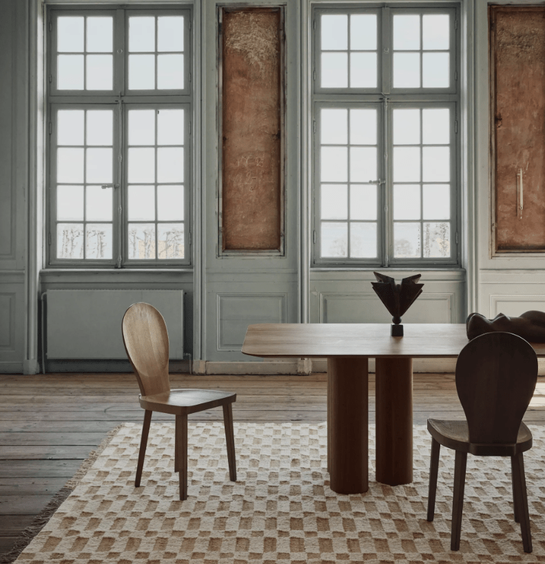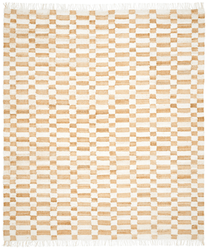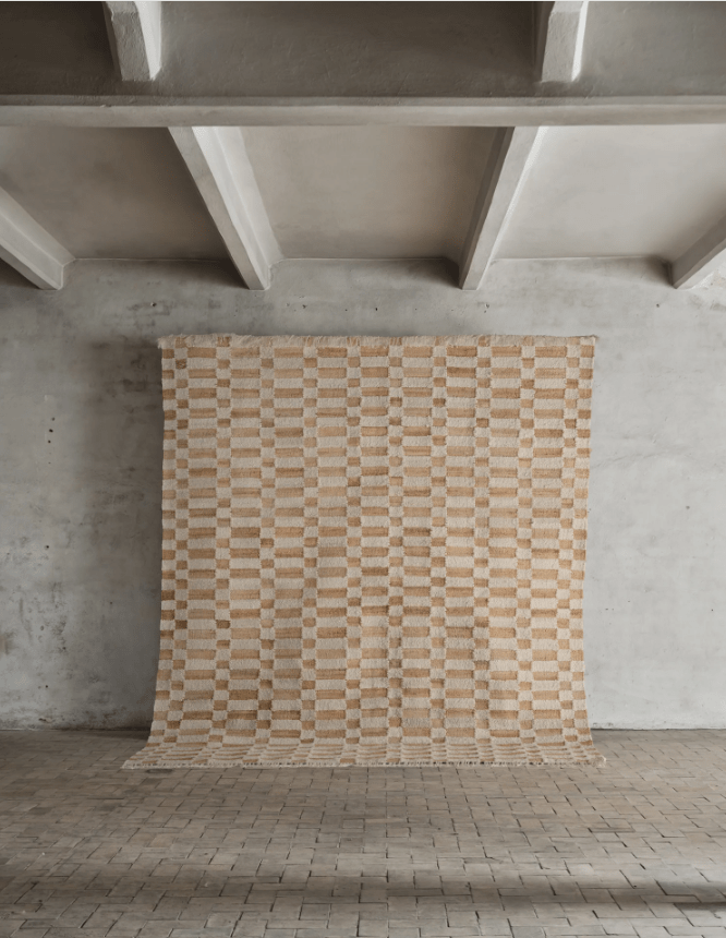 no. 23 is a light, flat-woven, handmade rug crafted from natural materials. It features a checkered pattern that combines natural jute with slub yarn in white natural wool. The mix of jute and slub yarn creates a three-dimensional look and feel, adding a unique touch to its classic, timeless design.