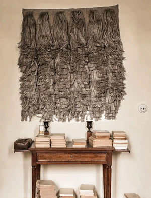 El tapiz n.º 05 es una vibrante pieza de pared hecha de lino 100 % natural. Es una decoración expresiva, diseñada con largos flecos que le dan un aspecto artesanal. Es una interpretación vanguardista del arte textil tradicional: artesanal y única.