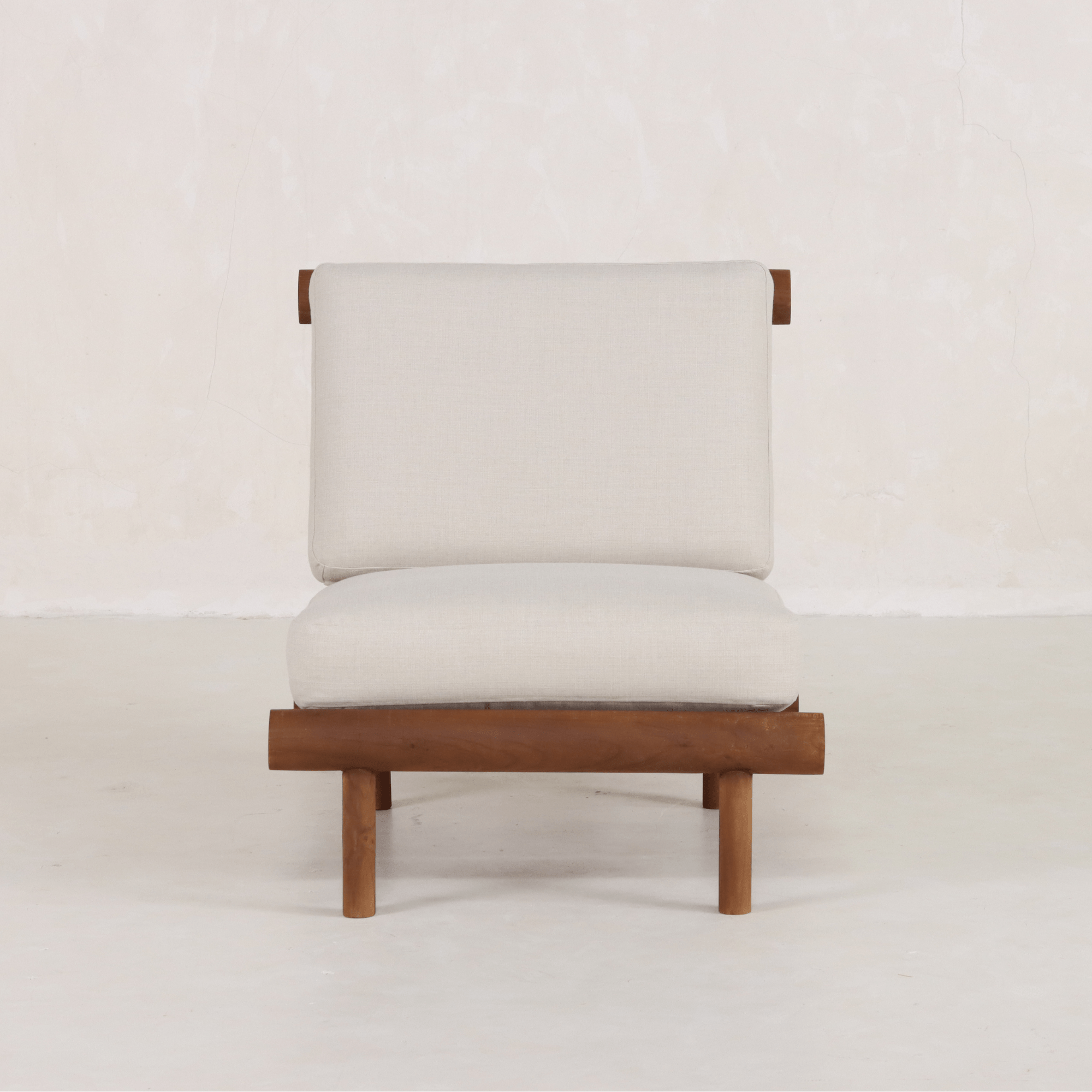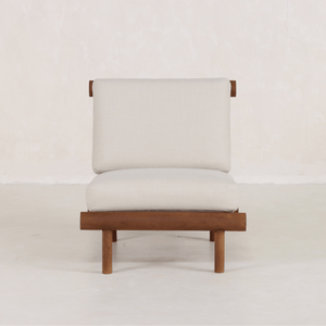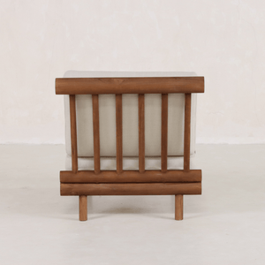 Perfecta para disfrutar de agradables veladas junto a la chimenea o charlas bajo la luz de las estrellas junto a la hoguera, su estructura de teca artesanal y su sistema de cojines adaptables combinan comodidad con elegancia arquitectónica. Hecha a mano con secciones cilíndricas de teca por artesanos expertos, su estructura arquitectónica soporta mullidos cojines de dos piezas de lino resistente. Su construcción resistente a la intemperie garantiza que esta silla sea la compañera perfecta para la contemplación junto a la chimenea durante todo el año. Cada pieza exhibe una artesanía excepcional a la vez que ofrece una comodidad versátil tanto para interiores como para exteriores.