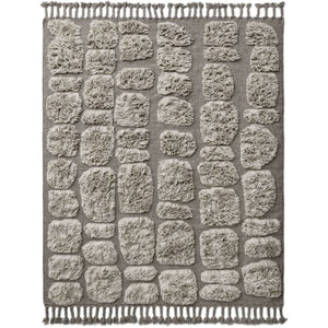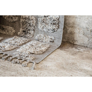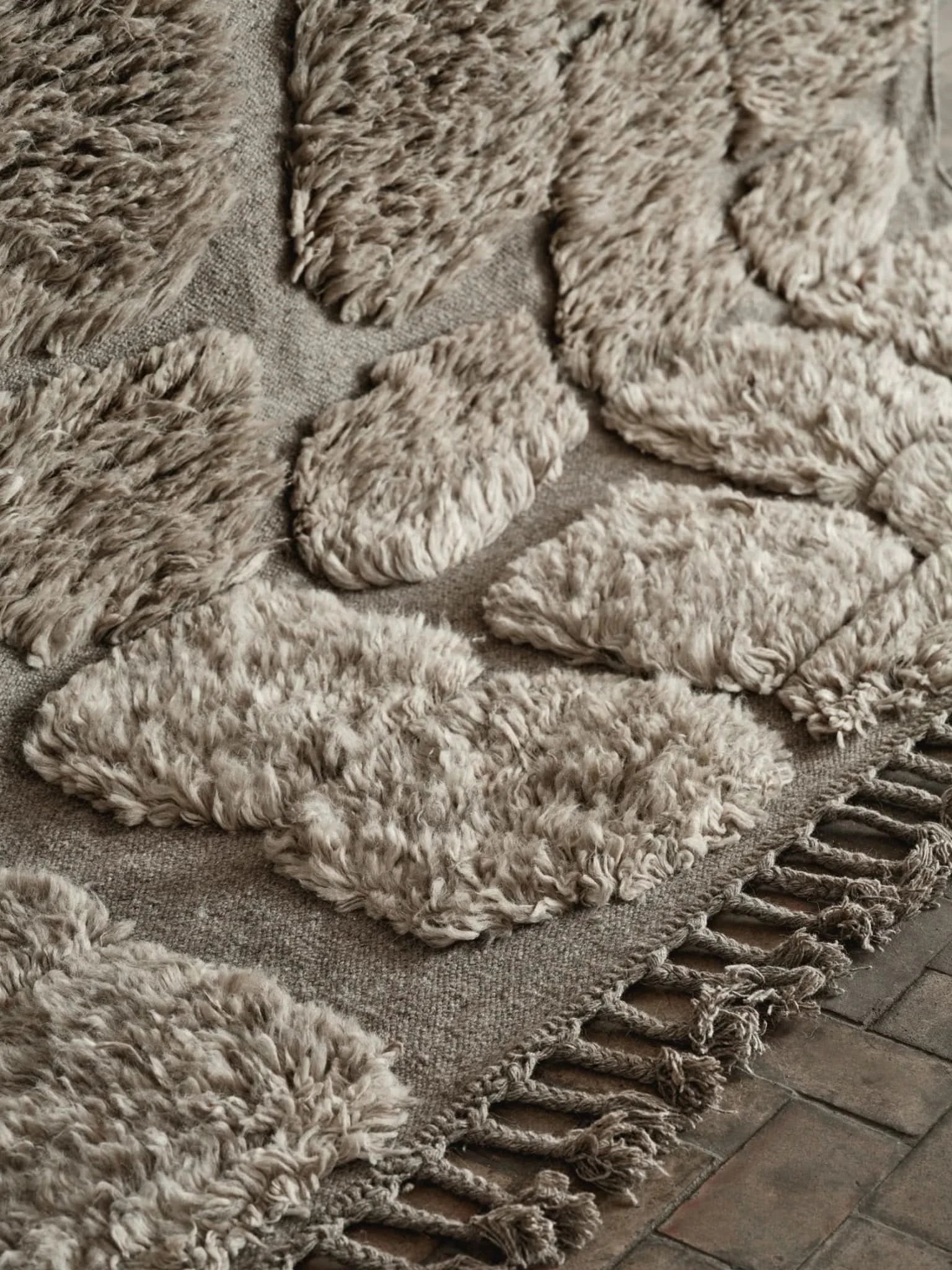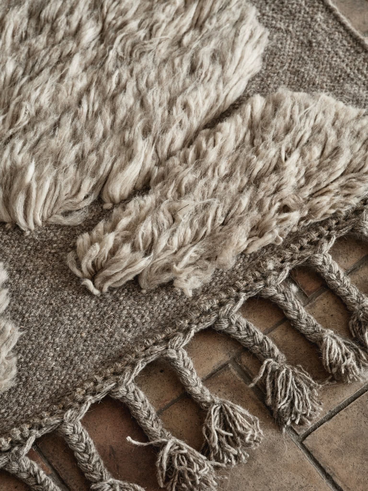 número 03 Es una alfombra contemporánea y atemporal anudada a mano en lana natural. El suave patrón de lana peluda crea un aire orgánico y bohemio en esta pieza emblemática. La alfombra está hecha de lana natural sin blanquear en un suave tono gris caliza y arcilla. Un borde trenzado con flecos gruesos realza el remate y añade un toque artístico y étnico.
