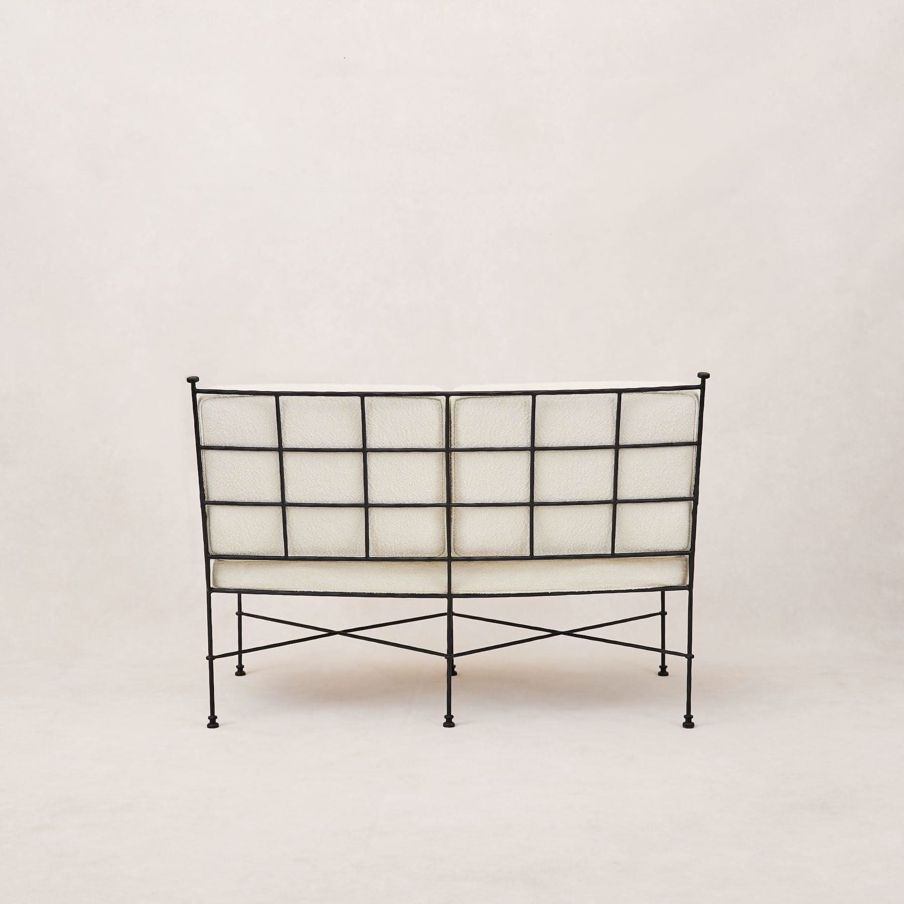 Fabricado con una esbelta estructura de hierro hecha a mano, combina durabilidad con belleza atemporal, garantizando que disfrute de su encanto durante años. Su suave bouclé resistente a la intemperie promete una comodidad duradera, lista para abrazarlo en días soleados y noches estrelladas. Lo que realmente distingue al Loveseat Provence es su diseño escultural; incluso con los cojines ocultos, la estructura se convierte en un punto focal impactante, realzando la estética de su exterior durante todo el año.