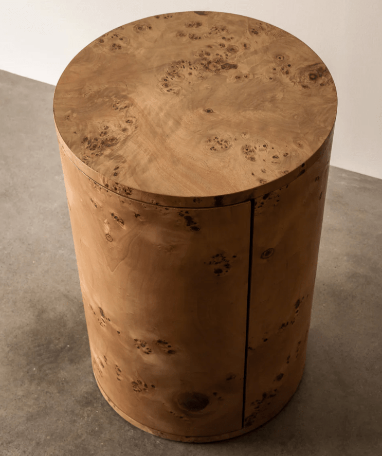 Tan sencilla como opulenta, la mesa auxiliar redonda Vernier irradia calidez y curiosidad con curvas plenilunio que revelan estantes internos ocultos. Una mesa tanto como una escultura, su forma simple, en equilibrio con su veta y textura, ofrece una repisa de galería donde el ojo del curador puede colocar sus objetos, piezas y posesiones favoritas.