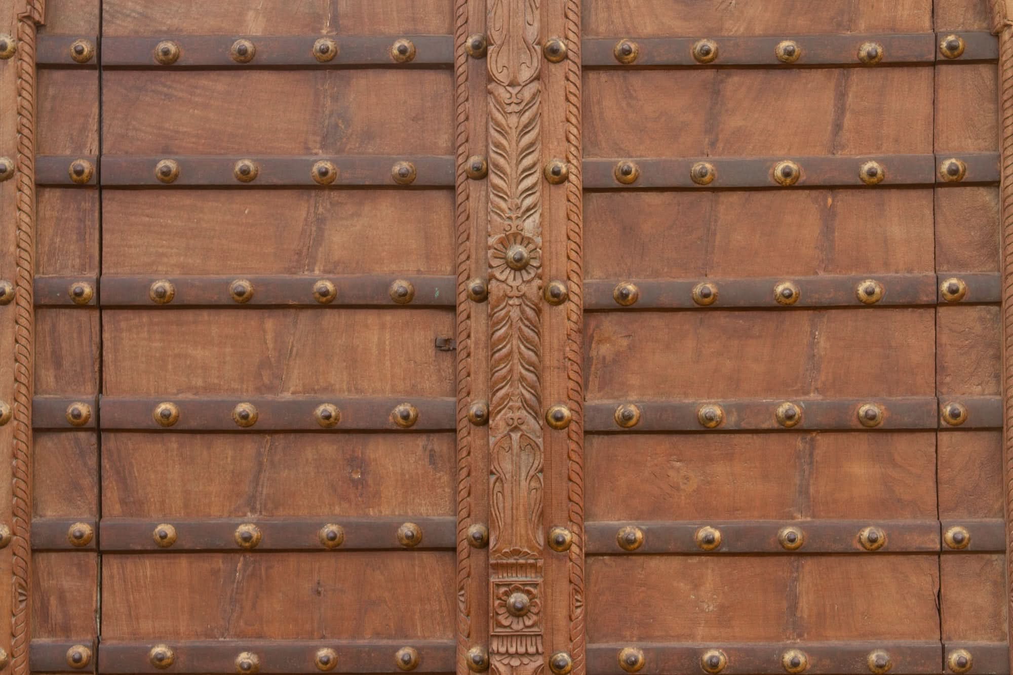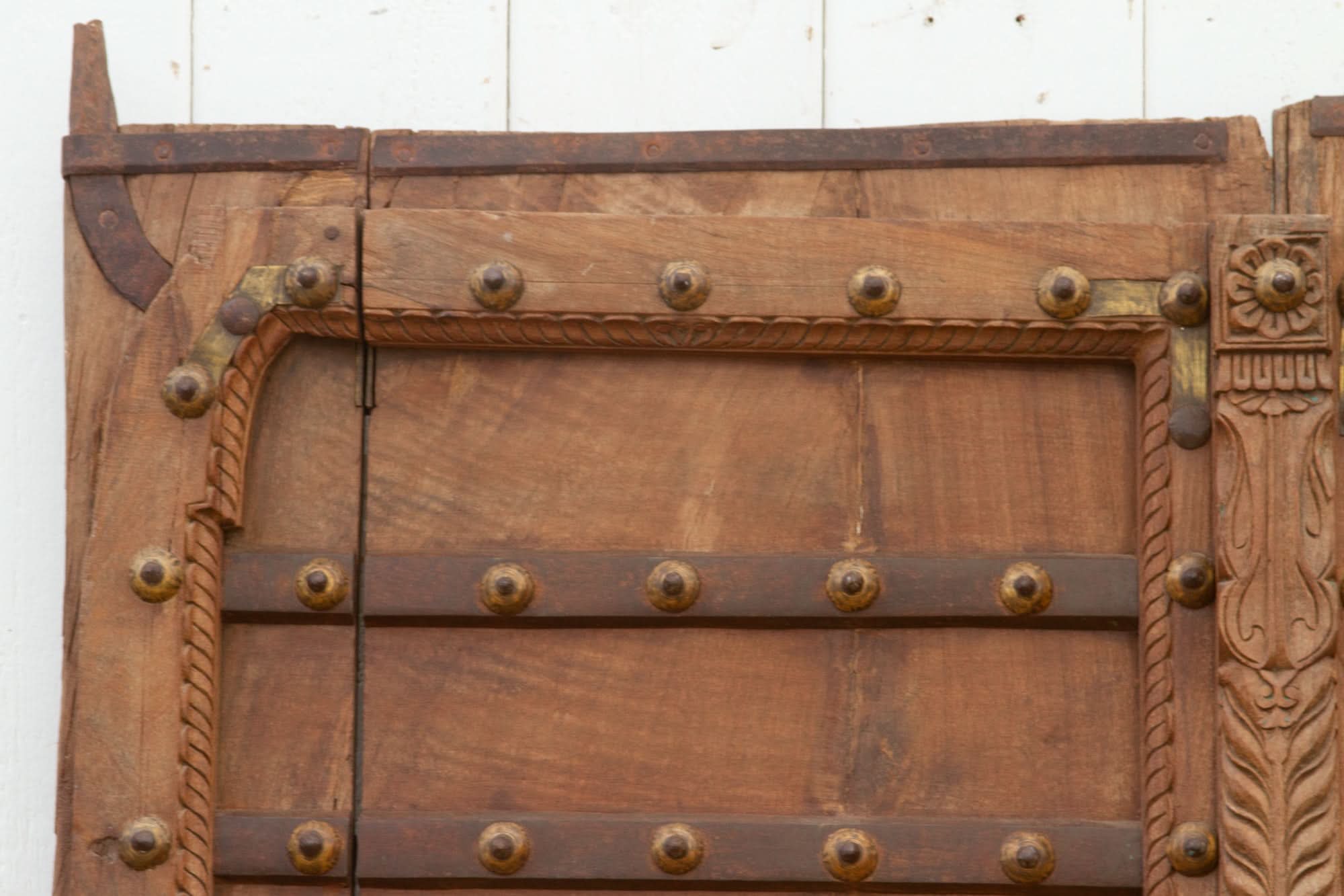 Remarquable porte indienne du XIXe siĂšcle, vĂ©ritable chef-d'Ćuvre, rĂ©alisĂ©e en teck massif et renforcĂ©e de fer. Son style unique est exclusivement originaire du Shekhawati, au nord du Rajasthan, rĂ©putĂ© pour ses ornements traditionnels en laiton qui contrastent magnifiquement avec les riches tons du bois. Le savoir-faire artisanal de cette porte se reflĂšte dans sa moulure centrale finement sculptĂ©e, ornĂ©e de motifs floraux et d'acanthes complexes, qui confĂšrent Ă cette piĂšce antique une touche d'Ă©lĂ©gance.