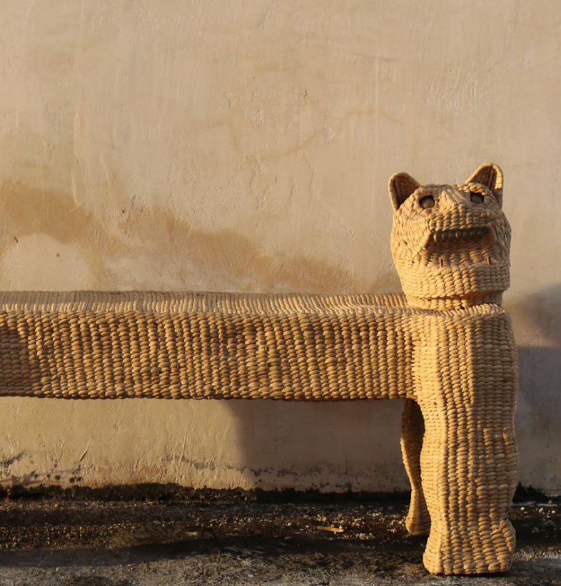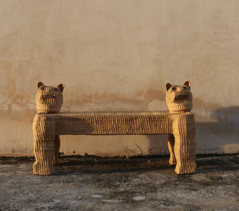 La structure du banc présente une forme robuste et élégante, avec une surface finement tissée qui met en valeur la texture naturelle de la chuspata. Sa couleur, chaude et terreuse, oscille entre le beige et le brun clair, lui confÚre un aspect rustique et chaleureux.