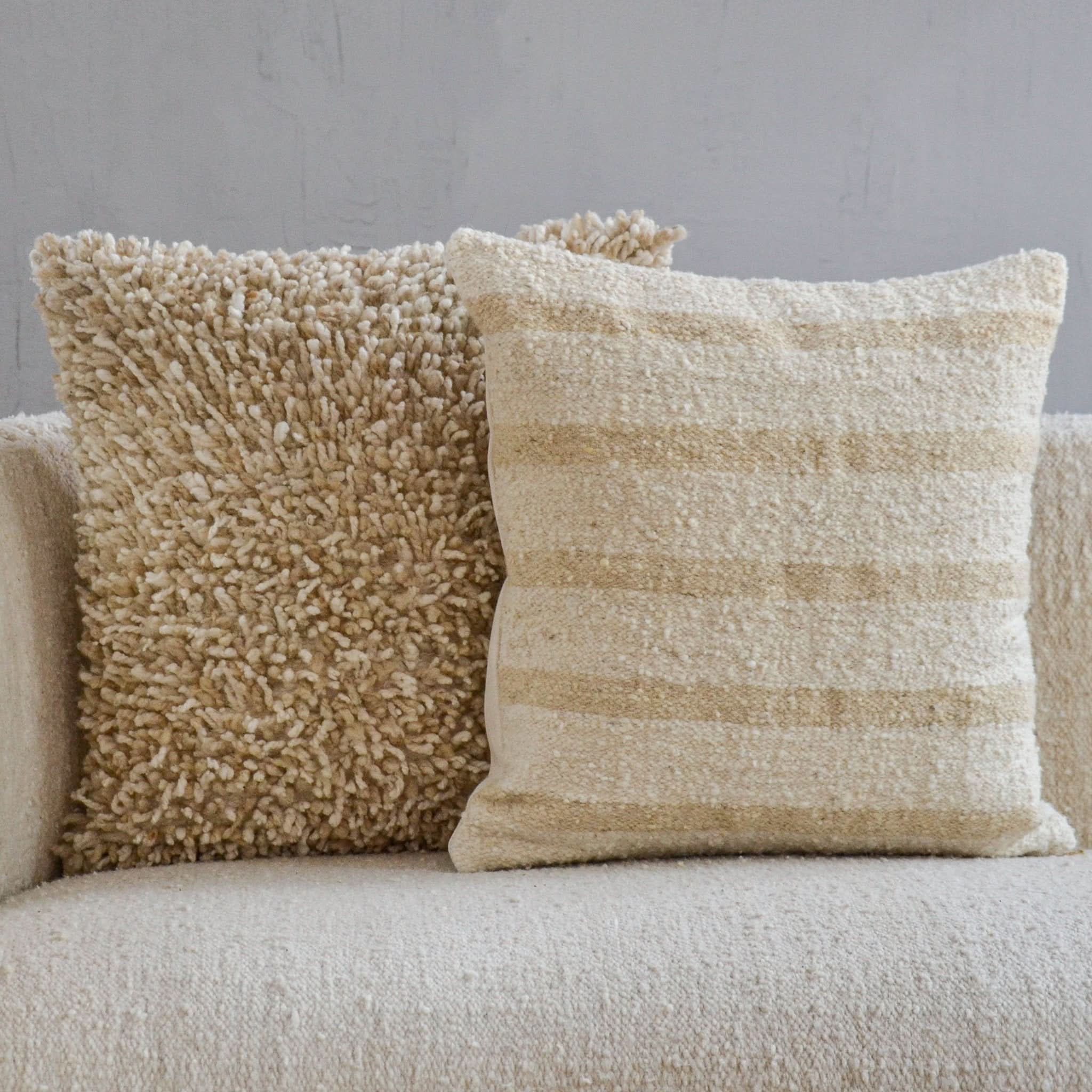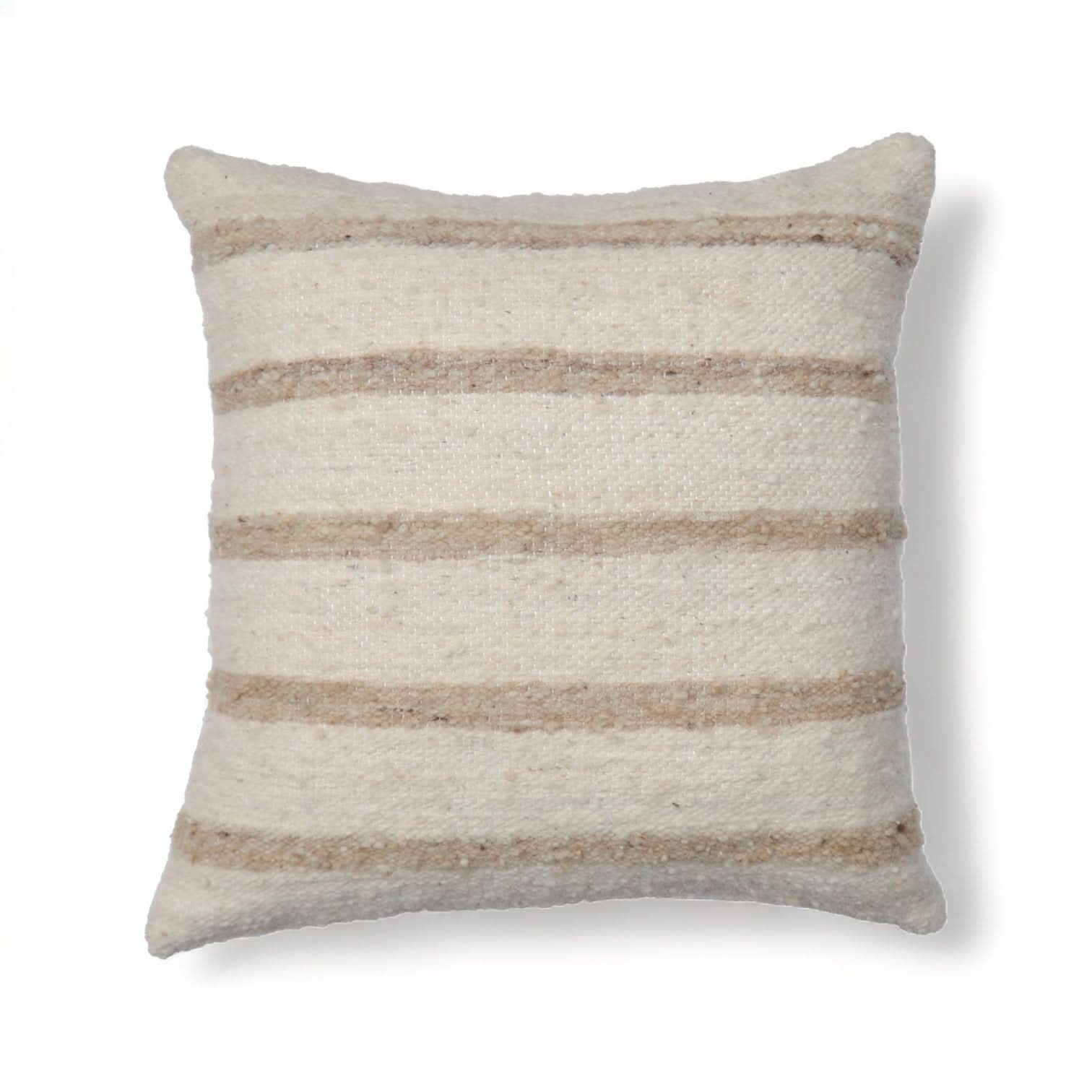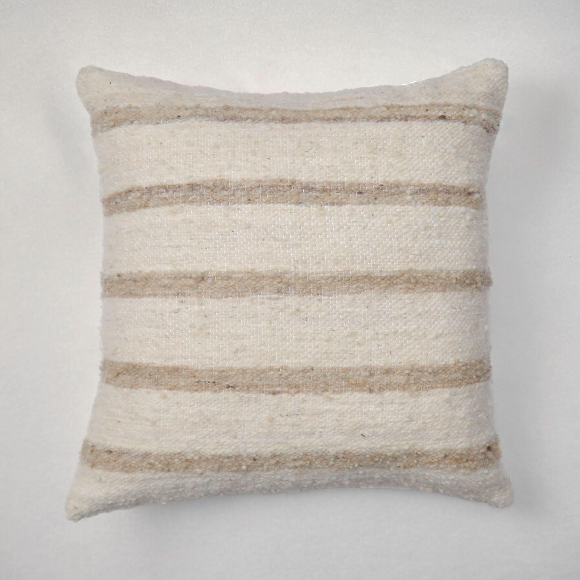 The Linear Pillow Covers are made in a pedal loom from 100% hand-spun wool. Each piece is hand-loomed in an artisan community in the Momostenango region of the Guatemalan highlands. The natural wool gives it a lush luxurious feel. Our pillows are crafted by hand, one at a time, so there will be slight variations in size and color. Through your purchase, you are helping to create sustainable income opportunities for Guatemalan artisans. ________ Natural Ivory Front: Natural hand-spun wool with a cotton warp / Back: 100% cotton canvas Pillow inserts are not included. ________ Care: Each pillow is hand-loomed using handspun wool, spot clean only. This product is not intended for high traffic or commercial use. ________