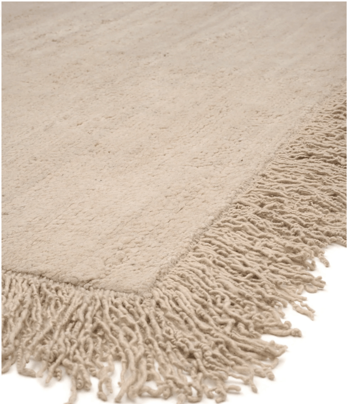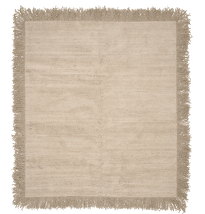 The heavy and compact rug in luxury chunky wool is cut in a short pile and made of unbleached wool with a natural mélange that gives it life and authenticity. The bold and curly hand-spun slub-yarn frames the edges and lends a soft vibe to this elegant rug.